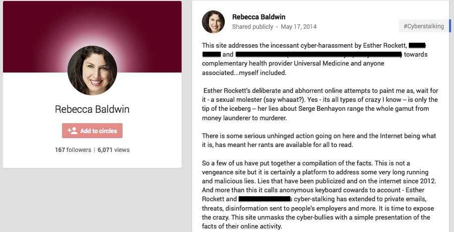 I name Universal Medicine’s cartel of promoters. They name me and two friends adversely affected by their activities. They whine that they’re victims of cyber-bullying. They manufacture a website to falsely defame us and invade our privacy.