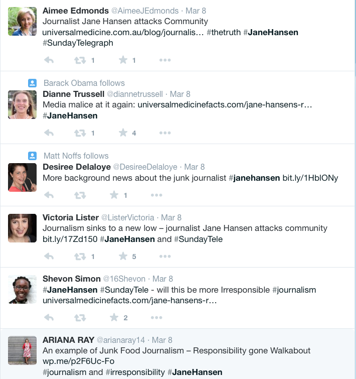 Although Serge Benhayon denies he directs his ‘Facts Team’ on what to write, the Sunday Telegraph’s email sent directly to his address on Thursday March 5 was posted on “The Facts” site shortly after with six more blogs including “Jane Hansen Revenge Trail” and “Jane Hansen and Junk Food Journalism” complete with over 600 comments on my lack of integrity and professionalism. Daily Telegraph